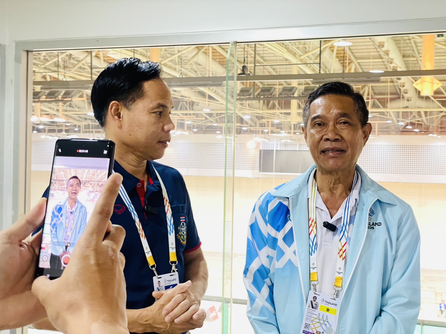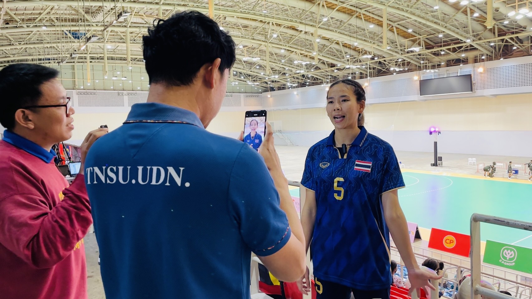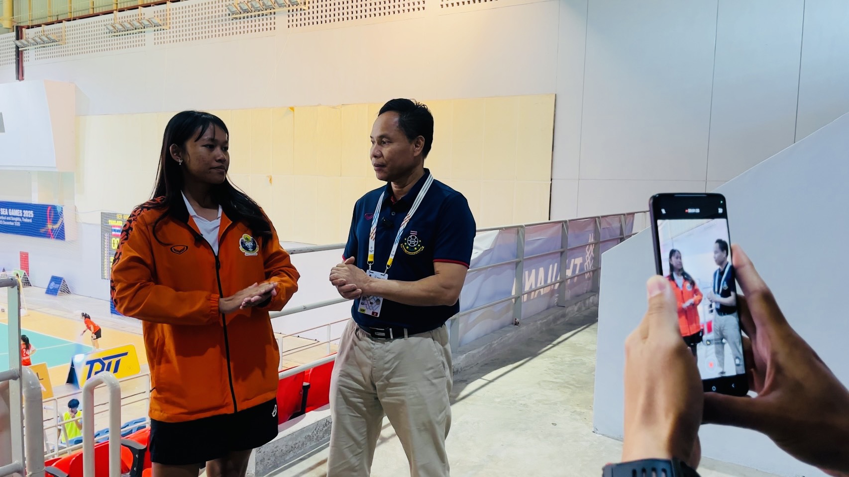 ต่อมาภายหลังจบการแข่งขันกีฬาแฮนด์บอลหญิง ซึ่งทีมชาติไทยเอาชนะทีมชาติสิงคโปร์ด้วยสกอร์ 29 ต่อ 23 คะแนน ได้สัมภาษณ์ นายสานิตย์ เอี่ยมผู้ช่วย ผู้ช่วยผู้ฝึกสอนแฮนด์บอลหญิงทีมชาติไทย และนางสาวนัทวรรณ ครอบบัวบาน (บีม) ผู้เล่นตำแหน่ง Left Back กัปตันทีมแฮนด์บอลหญิงทีมชาติไทย เกี่ยวกับภาพรวมการแข่งขัน ความพร้อมของนักกีฬาและแนวทางการพัฒนากีฬาแฮนด์บอลของประเทศไทยในระดับนานาชาติ